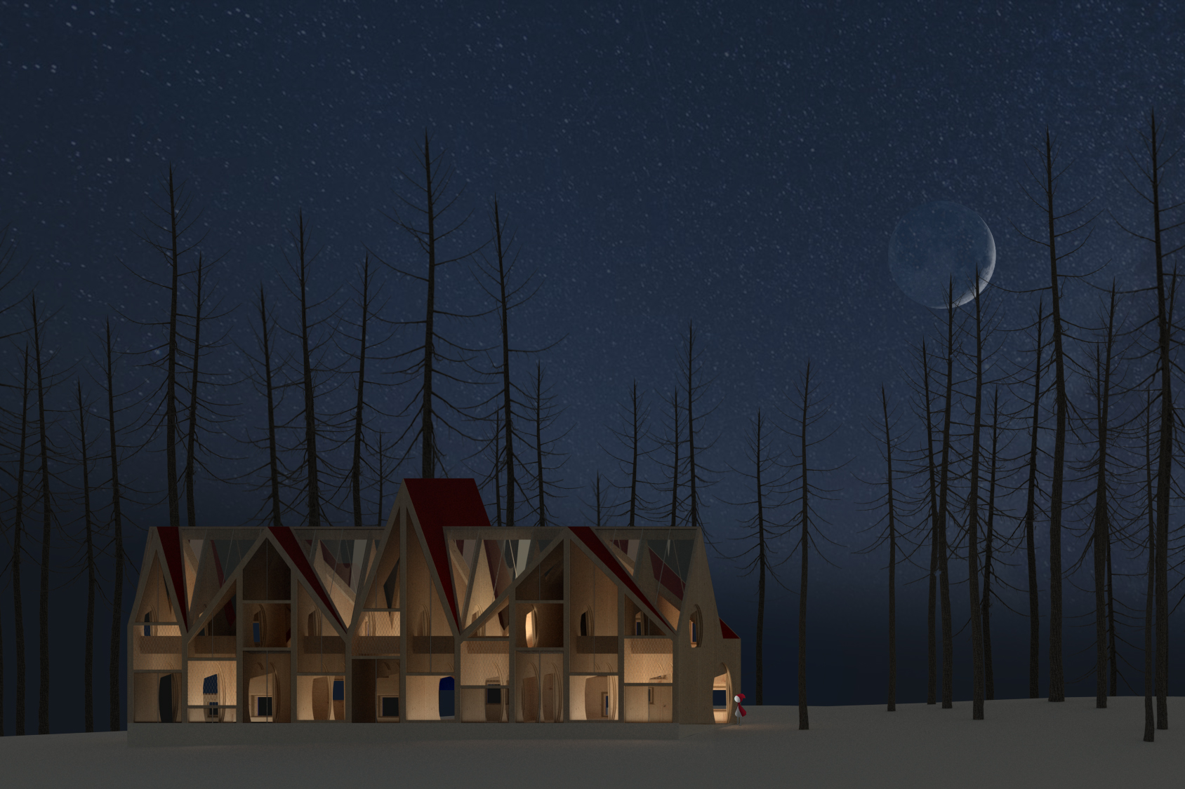 In America, the dominant typology of single-family housing is Type V wood frame construction. 2 x 4’s framing out generic homes. A CLT McMansion questions the potentials of introducing a fresh take on an old material, wood, to redefine the way housing could be constructed. The project recreates the kitschy American McMansion façade using cross-laminated timber while exhibiting a contemporary cross-laminated timber façade on the back. The contemporary façade reads as an oversized framing where the CLT has become the 2x4, resembling a transition from old to new. The house utilized the mass customizable panelized nature of CLT to create a series of marching walls to construct the house. A series of Booleans are then routed into the panels to beginning linking and creating new spaces. Cross-laminated timber allows us to embrace the nostalgia of wood while advancing into contemporary technologies and construction.
