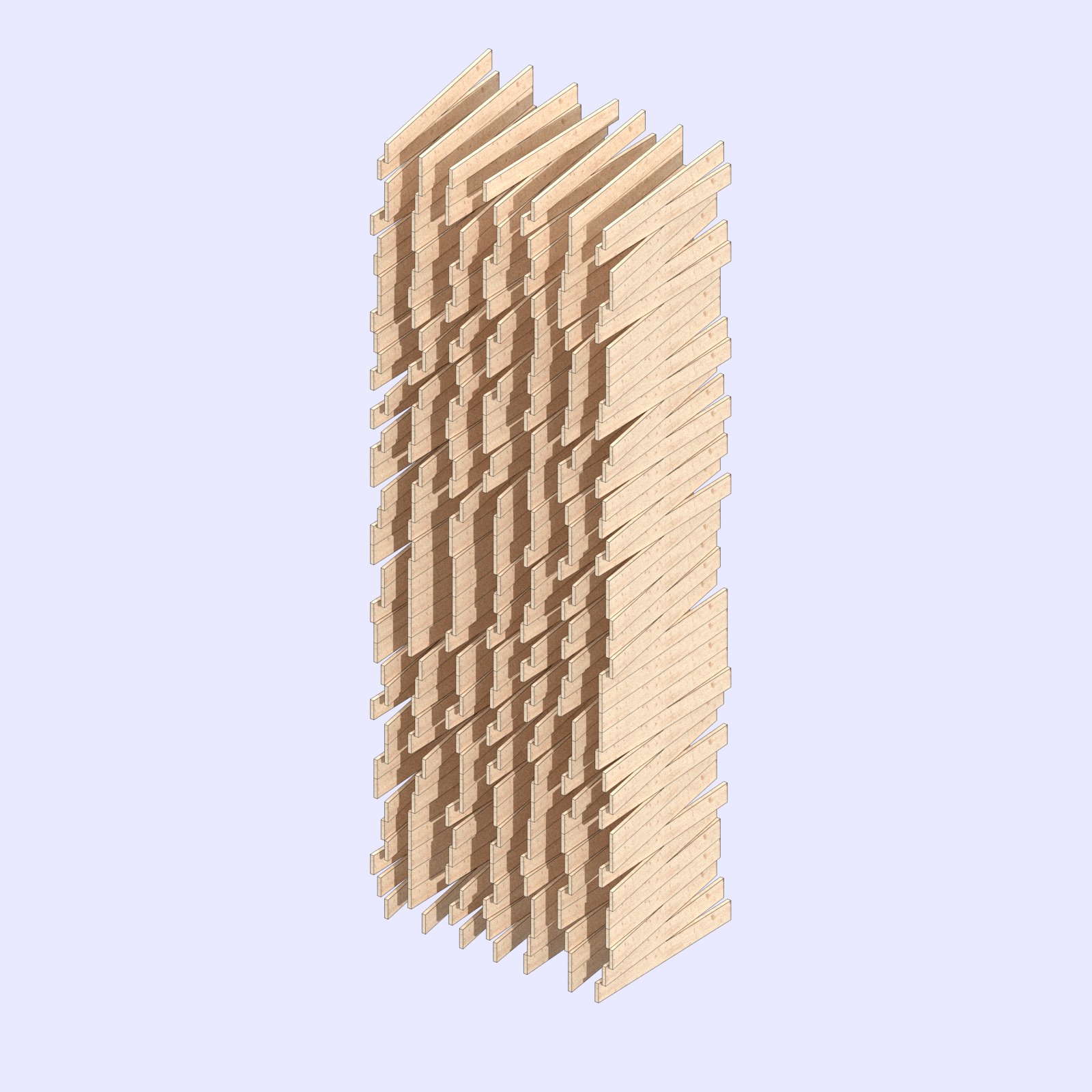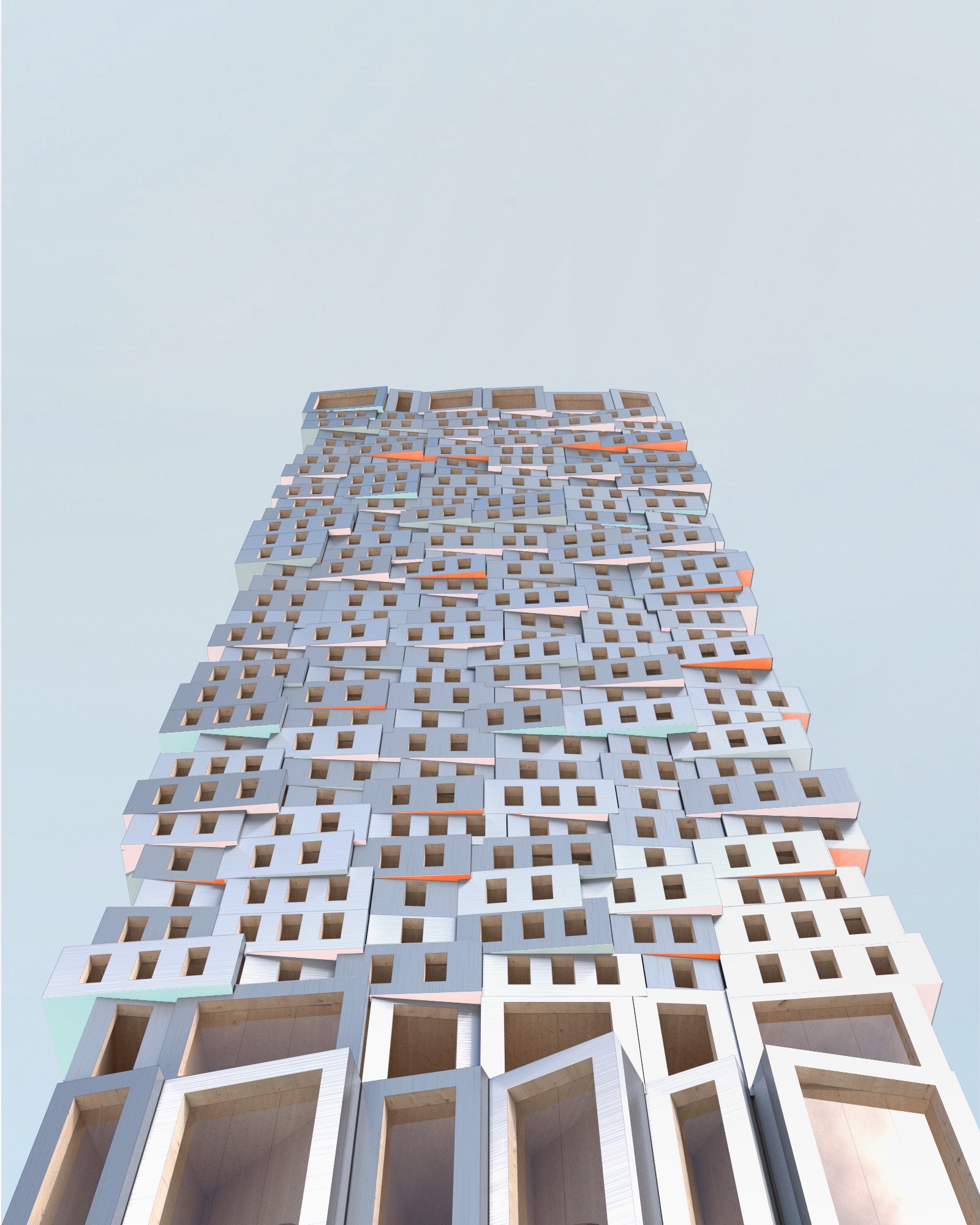 Balloons and Booleans stems off A CLT McMansion, investigating how cross-laminated timber morphs as the scale moves from a suburban house to a residential tower. Similar, the tower uses a series of marching walls as structure, but walls are stacked upwards to create the tower. These stacked panels are rotated to create a mix of both affordable and market-rate housing and different bedroom types. The CLT panels are efficiently utilized as both main structure and room separation, capitalizing on CLT’s thermal, sound reduction, and structural properties. The wall roations are a series of 2.5 to 5-degree rotations to allow the walls to structurally transfer in their stack. By virtue of the material’s aesthetic and structural tendencies, the project looks to create towers intrinsically different from the generic glass monolith towers. CLT’s ability to build tall has the potential to radically change our skylines.